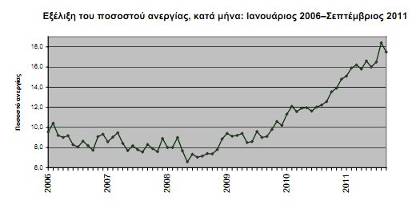 Σύμφωνα με τα στοιχεία της Ελληνικής Στατιστικής Αρχής (ΕΛΣΤΑΤ), οι απασχολούμενοι μεταξύ Σεπτεμβρίου 2011 και 2010 μειώθηκαν κατά 315.386 άτομα. Ταυτόχρονα, ο οικονομικά μη ενεργός πληθυσμός της χώρας, δηλαδή τα άτομα που δεν εργάζονται ούτε αναζητούν δουλειά ανήλθε στα 4.440.050 άτομα, ξεπερνώντας τον αριθμό των απασχολούμενων.