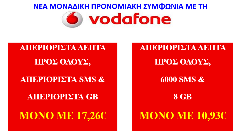 σας ενημερώνουμε ότι εξασφαλίσαμε ακόμη περισσότερα μοναδικά προνόμια για τα μέλη μας και τις οικογένειές τους, σε συνεργασία με την εταιρεία κινητής τηλεφωνίας Vodafone, σε προγράμματα κινητής τηλεφωνίας.