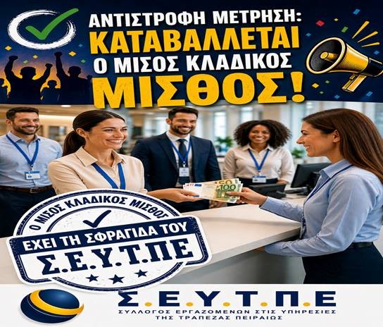 μας εμπιστευτήκατε, δεσμευτήκαμε, το κάναμε πράξη! Ο Μισός Κλαδικός Μισθός καταβάλλεται από φέτος και στο εξής σε όλους τους τραπεζοϋπαλλήλους!